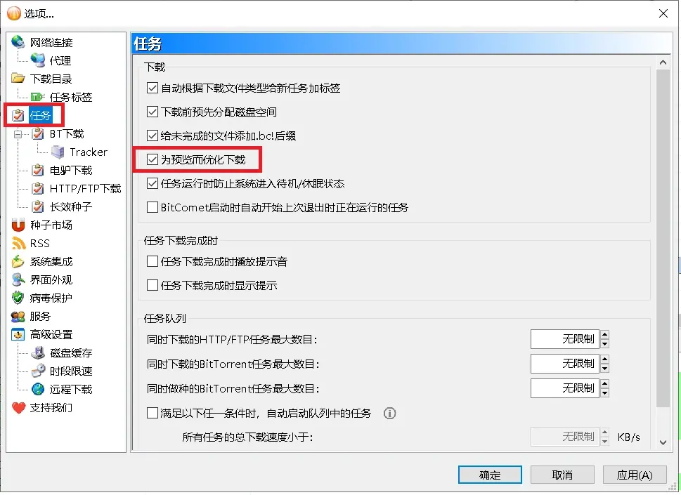 设置>任务>勾选 为预览而优化下载 这样会优先下头部和尾部分块