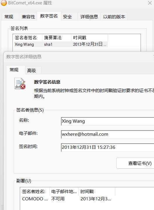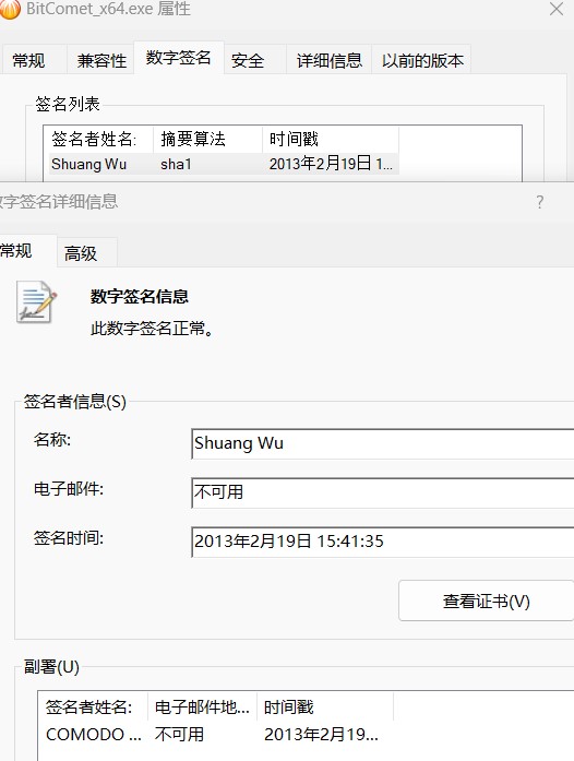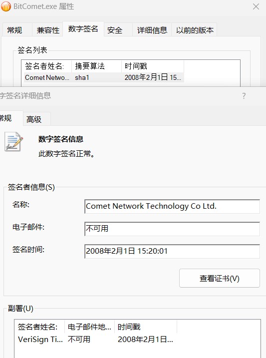 至少从0.99版本开始比特彗星使用 “Comet Network Technology Co Ltd.” 作为签名
