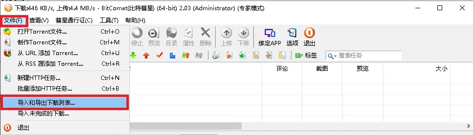 导出: 打开彗星 选择 文件>导入和导出下载列表