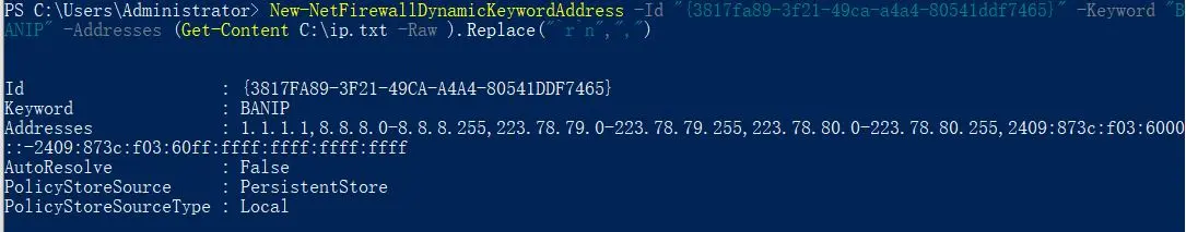 New-NetFirewallDynamicKeywordAddress -Id $DYKWID -Keyword "BT_BAN_IPLIST" -Addresses (Get-Content -Raw $IPFILE).Replace("`r`n",",") | Out-Null