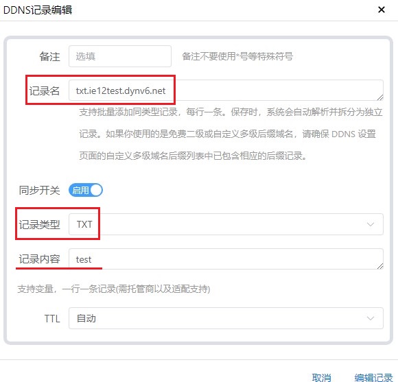 - 记录内容:填写要添加到TXT记录中的内容 此处填写 "test" 作为演示