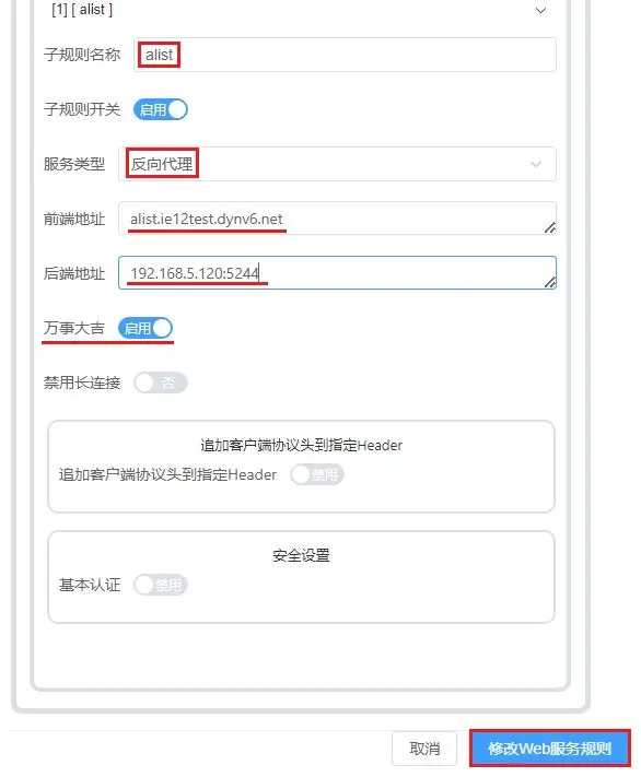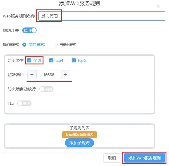 - 监听端口 与之前设置的反向代理规则使用相同的端口