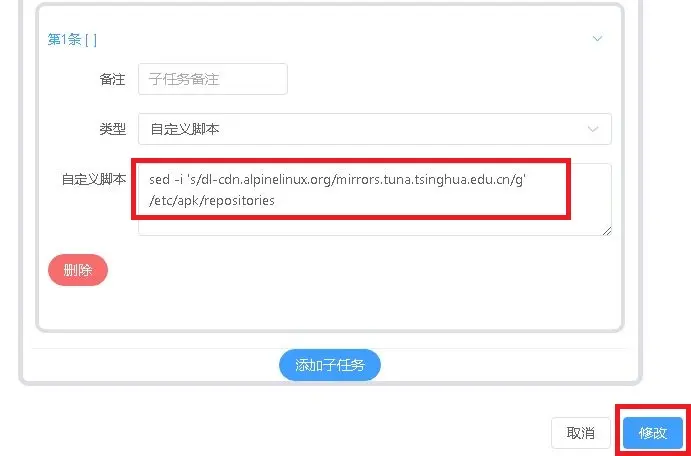 sed -i 's/dl-cdn.alpinelinux.org/mirrors.tuna.tsinghua.edu.cn/g' /etc/apk/repositories