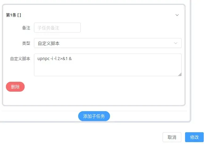 upnpc -i -d 穿透通道监听端口 穿透类型 2>&1 &