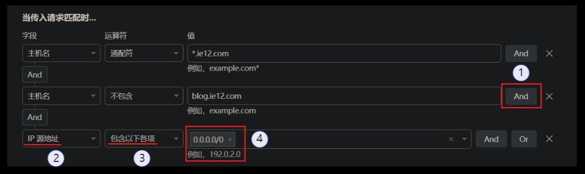 字段选择 IP源地址 运算符 选择 包含以下各项