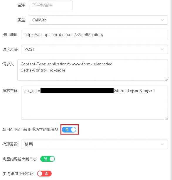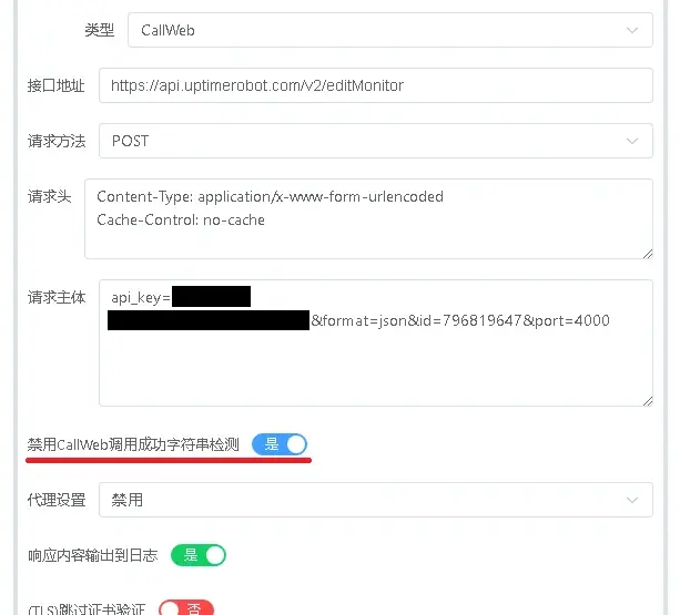 同时将 禁用Webhook接口调用成功字符串检测 改为 否