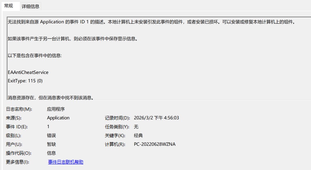 无法找到来自源 Application 的事件 ID 1 的描述。本地计算机上未安装引发此事件的组件,或者安装已损坏。可以安装或修复本地计算机上的组件。