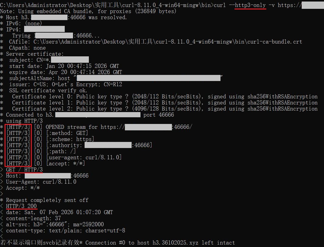 强制使用HTTP3连接站点 curl --http3-only -v URL V要小写 其中的v参数用于显示连接详情