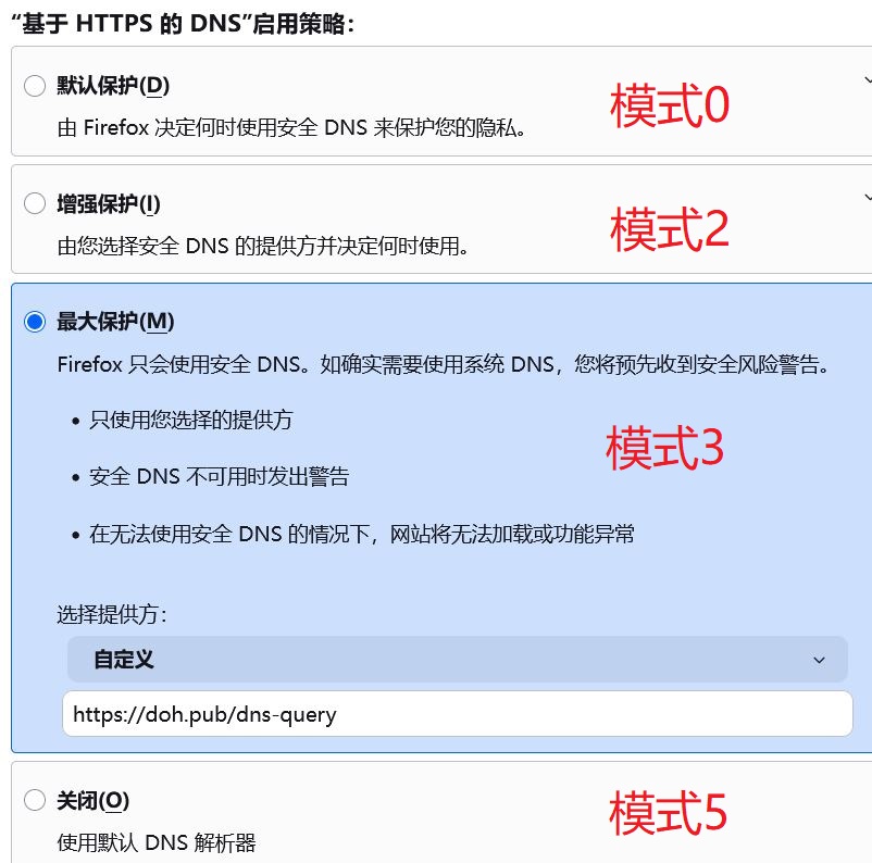 3 - 仅使用。仅使用 TRR。从不使用原生解析器。(此模式还需要设置 bootstrapAddress 首选项。)
