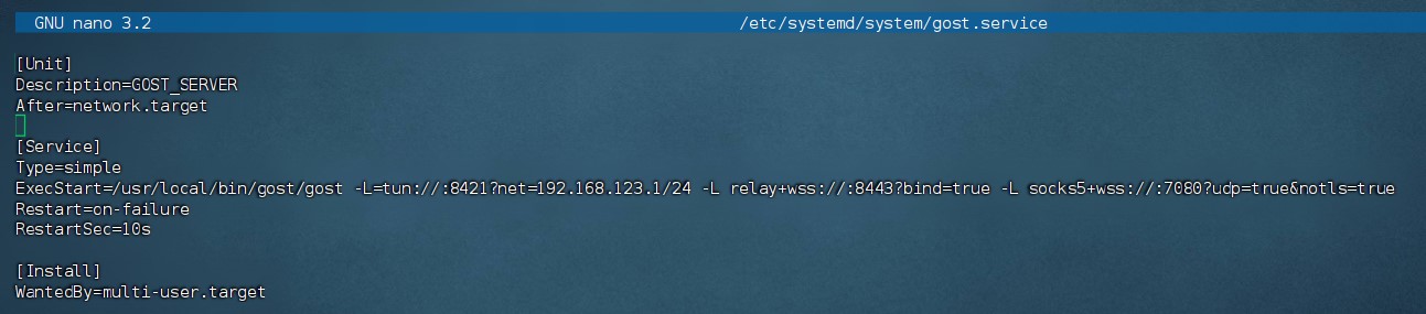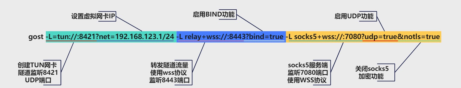 C:\Users\Administrator\Desktop\gost\gost.exe -L="tun://:0/:8421?net=192.168.123.2/24&name=gost_tun" -F relay+wss://服务端IP:8443